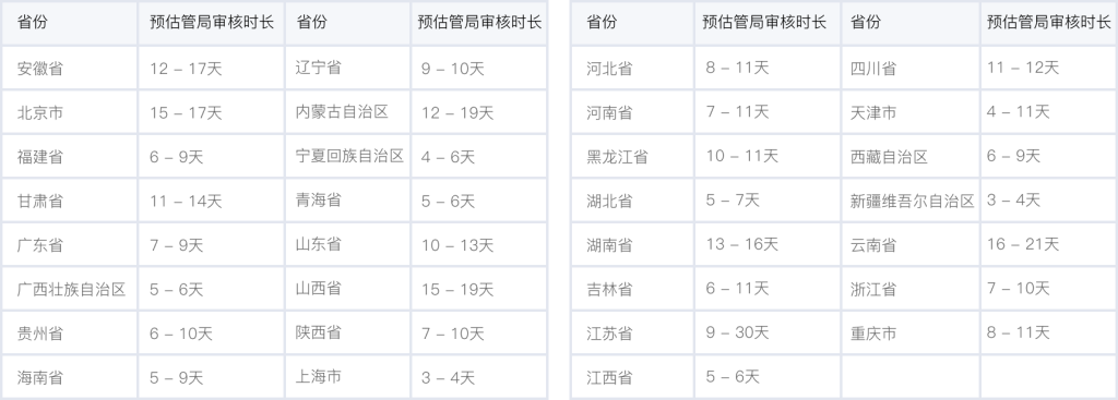 各個省管局預(yù)計(jì)審核時長,實(shí)際審核時長會根據(jù)備案場景有所不同,下表格僅供參考。詳情可查看 詳細(xì)規(guī)則。